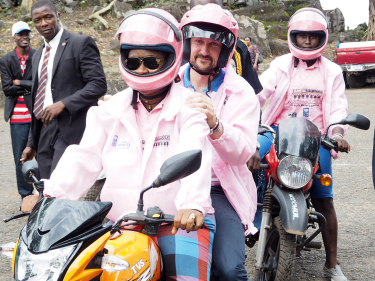 Liberia 2017Pink Panthers er en gruppe damer med hver sin motorsykkeltaxi. UNDP bistår med god kjøreopplæring og sikkerhetsutstyr. Kronprinsen fikk snakket med damene om hva denne jobben betyr for dem: Mat på bordet og skolegang for barna var det gjennomgående svaret. Foto: Christian Lagaard, Det kongelige hoff. -