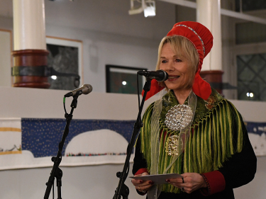 Sámediggepresideanta Aili Keskitalo rabai čájáhusas. Govva: Sven Gj. Gjeruldsen, Gonagaslaš hoavva