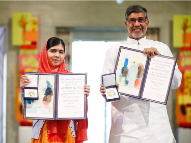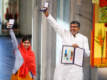 Olbmot čuoččahedje ja doško gieđaid goappešat Nobelbálkkašumi vuitiide sudno garra logaldallamiid maŋŋá, ja sudno ávžžuhusaide ahte addit doarjaga ja bargat juoidá máilmmi mánáide buorrin.