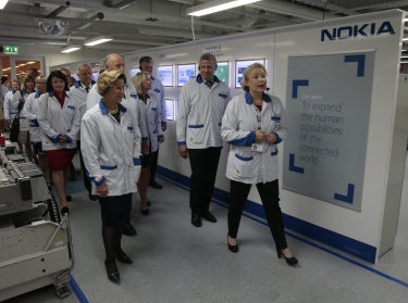 Gonagasbárra loahpahii stáhtaguossástallama davvin Suomas – Uleåborgas, gos earet eará stuora Nokia kommunikašuvdnahoiddus lea fabrihkka. Teknologiija ja dearvvašvuohta lea otná áššin.