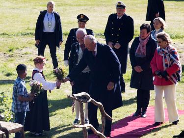 Musihkkárat ja skuvlamánát vuostáiválde čuojahemiin ja somás láhttemiiguin Gonagasbára go soai olliiga Vollmoenii Engeløyas eske veaigin. Loge jahkásaš Amanuel Yemane Leines skuvllas ja gávcce jahkásaš Lea Kristin Nilsen Nordfold skuvllas attiiga liđiid Gonagasbárrii ovdal go kulturprográmma álggii.