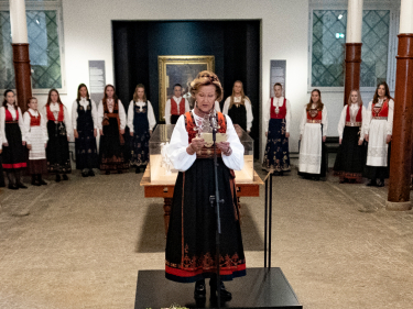 Dronning Sonja ønsket velkommen til åpningen, omgitt av bunadskledde fra Det Norske Jentekor. Koret ga vakkert tonefølge under arrangementet.