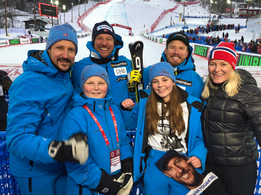 Kronprinsfamilien jubler for dobbelt norsk i Aksel Lund Svindals siste renn. Foto: Privat