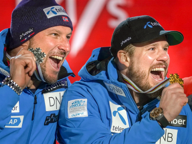 Verdensmester Kjetil Jansrud og Aksel Lund Svindal viser frem gull- og sølvmedaljen etter utfor for menn under VM i alpint i Åre lørdag. Foto: Cornelius Poppe / NTB scanpix