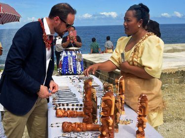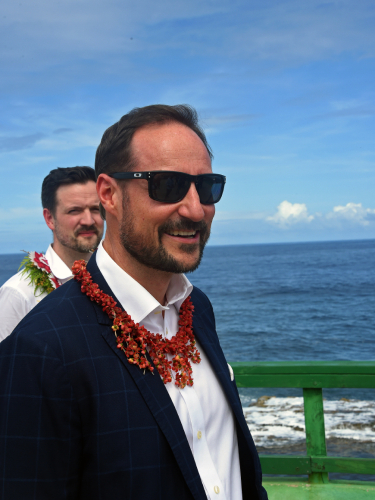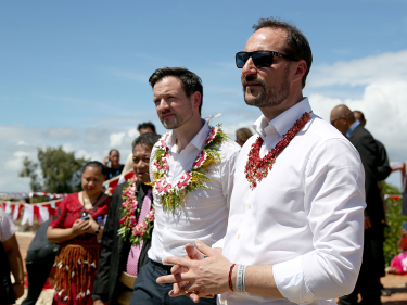 Ruvdnaprinsa Haakon ja ovddidanministtar Dag-Inge Ulstein Ahau Beachas Tongas. Govva: Karen Setten / NTB scanpix