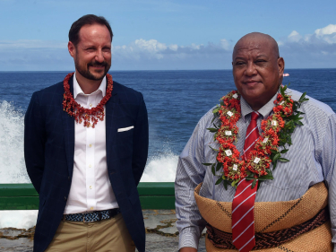 Ruvdnaprinsa oaččui Tonga vearjogalbba skeaŋkan čoahkkimis sadjásaš stáhtaministariin Semisi Sikain. Govva: Sven Gj. Gjeruldsen, Gonagaslaš hoavva