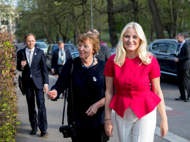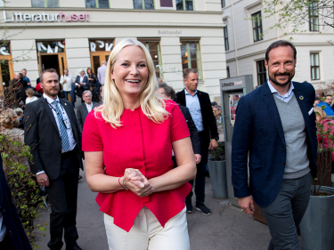 Kronprinsesse Mette-Marit ankommer litteraturfestivalen ledsaget av ordfører Marianne Borgen. Foto: Vidar Ruud / NTB scanpix