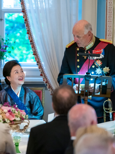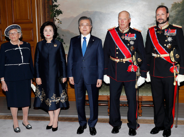 Odne beasai Majestehta Gonagas sávvat buresboahtima Eksellense Presidentii Moon Jae-in ja vuosttašroavvái Kim Jung-sook. Dat lea vuosttaš geardi go Korea stáhtaoaivámušat leat stáhtaguossástallamis Norggas.