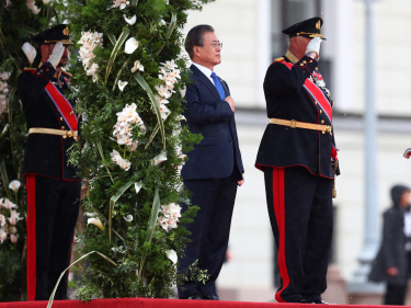 Maŋŋil lieđđeseremoniija doalai Presideanta Moon Jae-in sártni Universitehta Aulas. Son sártnui dan birra mot geaidnu viidáseappot berre leat olahan dihtii bistevaš ráfi Koreanjárgii. Maŋŋil su sártni, ságastalai Presideanta Moon olgoriikaministariin Eriksen Søreide. Ságastallama láidii Laura Bicker - BBC korrespondeanta Seoulas.