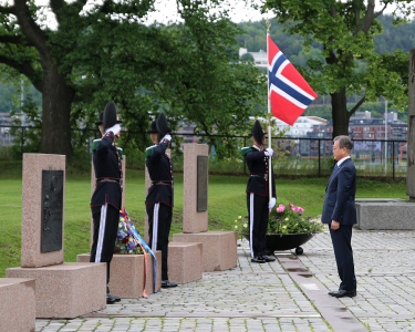 Lea dáhpin ahte guossástalli stáhtaoaivámušat bidjet lieđđekránssa Akershus galbba Našunálamonumeantta lusa, ja dien láhkái gudnijahttet sin geat sođiin leat gahččan Norgga ovddas. Odne lei Akershus seremoniija viiddiduvvon vel ovttain lieđđebidjamiin.