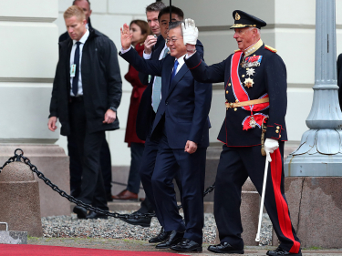 Eahkes ledje gállamállásat Gonagaslaš šloahtas gudnin Korea presidentii ja vuosttašroavvái. Gonagas Harald rámidii Korea ja Presideantta 2018 Olympiija gilvvohallamiid lágideami ovddas: