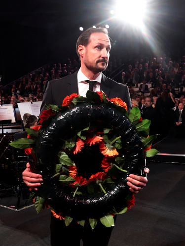 Kronprins Haakon plasserte Noregs krans framfor minnesmerket. (Foto: Yad Vashem)