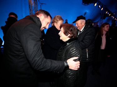 Kronprins Haakon i samtale med Maria Gabrielsen – en av dem som overlevde Auschwitz. Foto: Lise Åserud / NTB scanpix