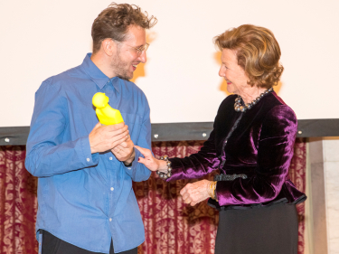 Juryleder Alfred Pacquement leste opp juryens begrunnelse før Dronning Sonja overrakte statuetten til den 35 år gamle kunstneren.