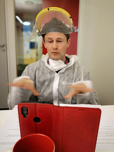 Angus McGunnigle var med på videomøte med Kronprinsen i fullt smittevernutstyr. Foto: Stina Bergsten, Norsk Arbeidsmandsforbund