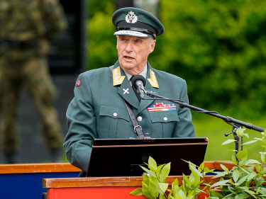Kommandánta Arne Opperud, stuoradiggepresideanta Tone Wilhelmsen Trøen (ii leat govas fárus), stáhtaministtar Erna Solberg, suodjalusministtar Frank Bakke-Jensen ja suodjalushoavda Haakon Bruun-Hanssen vuostáiválde Gonagasbára ja Ruvdnaprinsabára Akershus ladnis. Govva: Lise Åserud, NTB scanpix
