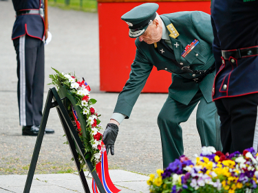 Gonagas Harald bidjá lieđđekránssa Našunálamonumeantta lusa. Govva: Lise Åserud, NTB scanpix