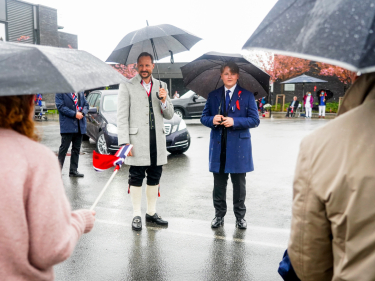 Ruvdnoprinsabearaš deaivvadii Askera skuvllaid ovddasteaddjiid, korpsaid ja koaraid Skauguma verráha olggobealde. Govva: Lise Åserud, NTB