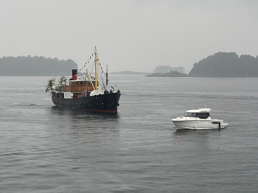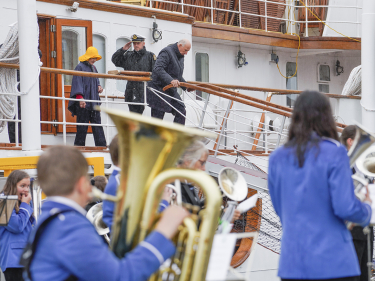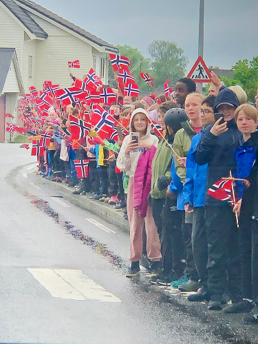 Korpsmusihkkarat Florø Hornmusikkas ja Florøskulen brassbandas čuojahedje arvedálkkis go Gonagasbárra vázzilii Gonagasskiippas vulos gáddái Fugleskjærkáijái Florøs – Norgga oarjjimus gávpogis.