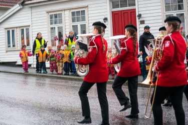 Korpsmusihkkarat gáhtas mársejit Gonagasbára galledeami vuolde. Govva: Simen Sund, Gonagaslaš hoavva