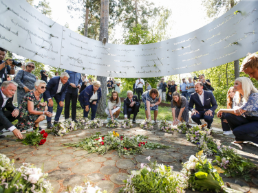 - Bahá lehpet jorahan buori guvlui, Ruvdnoprinsa Haakon dajai sártnistis. – Dáppe eai leat dušše geasseleairrat fas. Dii lehpet maiddái nagodan hukset internationála dovddusin guovddáža demokratijahuksema ja dieđu várás – ja vaši, konspirasjonsteoriija ja balu apmasa vuostá. Divvumiin ja huksemiin – fuolahemiin – lehpet nagodan fuolahit dárbbu sihke muitit ja muittašit, ođđa eallima dáhttubehtet deike Utøyai. Ođđa Utøya.