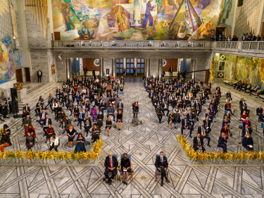 Gonagas Harald, Dronnet Sonja ja Ruvdnaprinsa Haakon celket olu lihku ráfibálkkašumi vuostáiváldiide Maria Ressa, Dmitrij Muratov ja Verdens matvareprogram jođiheaddjái David Beasley. Govven: Stian Lysberg Solum / NTB