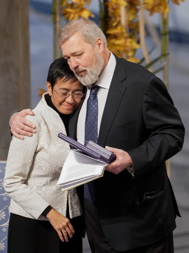 Journalistaguovttos Maria Ressa ja Dmitrij Muratov leaba vuostáiváldán Nobel ráfibálkkašumi rahčamušaid ovddas ovddidit cealkinfriddjavuođa Filippiinas ja Ruoššas. Gonagasbárra ja Gonagaslaš Allavuohta čuvvo doaluid Oslo ráđđeviesus.