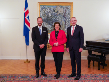 Ruvdnaprinsa Haakon, presideanta Guðni Thorlacius Jóhannesson ja ofelaš Kristín Jónssdóttir. Govven: Eythor Arnason / NTB