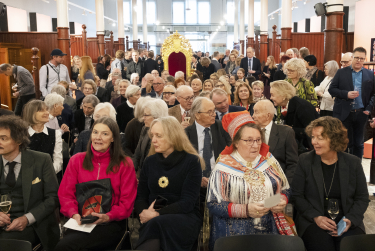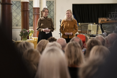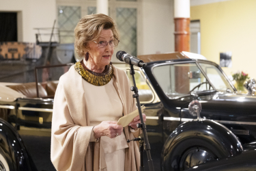 Girječálli Vigdis Hjort ovdanbuvttii berošteaddji teavstta broderema ja duddjoma birra čájáhusrahpamis. Govven: Øivind Möller Bakken, Gonagaslaš čoakkáldagat