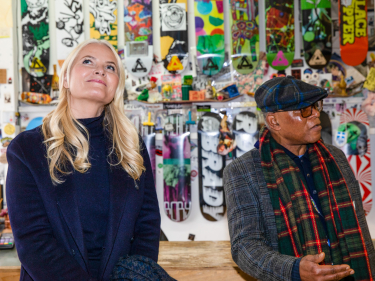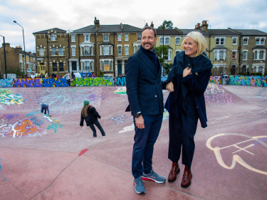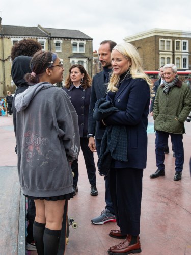 Ruvdnaprinsa Haakon ja Ruvdnaprinseassa Mette-Marit deaivvadeaba skaternuoraiguin Stockwell Skatepárkkas. Govven: Nina Rangøy / NTB