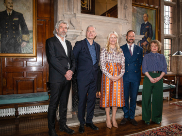 Kronprins Haakon og Kronprinsesse Mette-Marit møtte forfatterne Siri Helle, Lars Mytting og Karl Ove Knausgaard i ambassadørens residens i London. Foto: Nina Rangoy / NTB