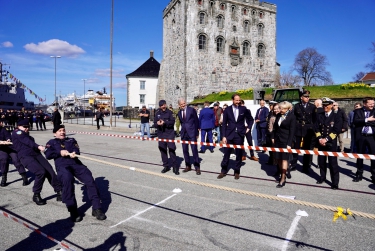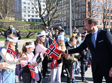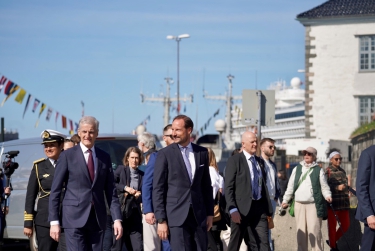 Kronprinsen startet besøket til Bergen med å hilse deltakerne på Regjeringens havkonferanse og One Ocean Expedition Summit i Håkonshallen på Bergenhus festning mandag morgen.