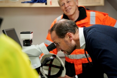 Kronprinsen fikk høre mer om hvordan Havforskningsinstituttet jobber med utfordringene knyttet til mikroplast i havet. Foto: Tuva Åserud / NTB