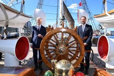 Kronprinsen og statsminister Jonas Gahr Støre om bord på seilskipet Statsraad Lehmkuhl. Foto: Sven Gj. Gjeruldsen, Det kongelige hoff