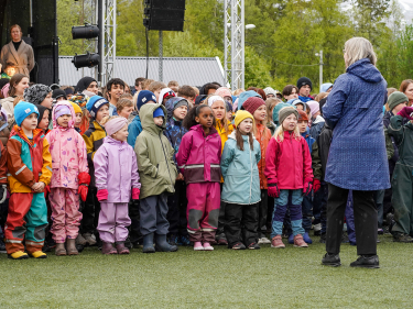 27 skuvlaoahppi lávlo Gonagassii ja Dronnegii go galledeigga čáppa Vevelstad girku. Govven: Liv Anette Luane, Gonagaslaš hoavva.