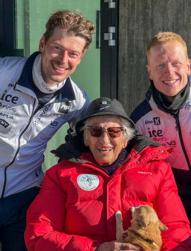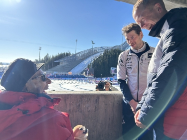 Det ble er vært muntert møte mellom Prinsesse Astrid og Johannes Thingnes Bø da Prinsessen takk skiskytterkongen for mange store idrettsopplevelser gjennom mange år. I midten Sturla Holm Lægreid. Foto: Sven Gj. Gjeruldsen, Det kongelige hoff