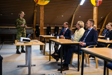 De besøkende fikken presentasjon om operasjon Gungne av sjef HV-12, Marianne Eidem under besøket til Heimevernet på Værnes i Trøndelag. Foto: Kristian Kapelrud, Forsvaret