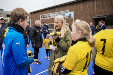 Kronprinsesse Mette-Marit møter Bodø/Glimts stjernelag. Foto: Stian Lysberg Solum / NTBTidligere på dagen, før kamp, fikk Kronprinsessen og Prinsen møte Glimts Stjernelag – et inkluderende fotballtilbud for barn og unge i alderen 6 til 15 år som har funksjonsnedsettelser, eller som ikke finner seg til rette på ordinære lag. Her står sosialt fellesskap, mestring og idrettsglede i sentrum.