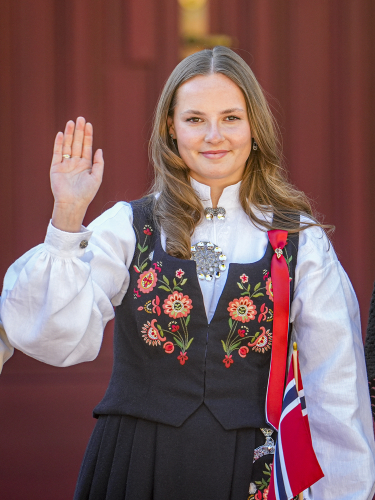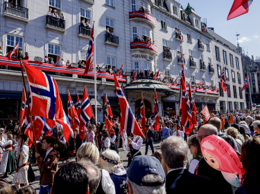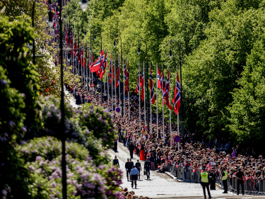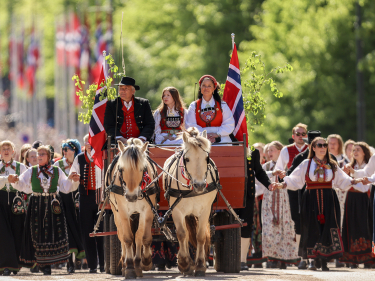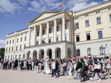 Fra Skaugum bar det inn til Slottet i Oslo, der de sluttet seg til Kongeparet for å hilse barnetoget fra Slottsbalkongen. Foto: Lise Åserud, NTB