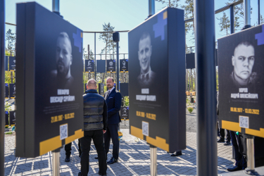 Ved minnesmerket ble det lagt ned krans for å vise respekt og minnes dem som har mistet sine liv i forbindelse med forsvaret av Ukraina. Foto: Heiko Junge, NTB