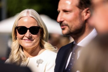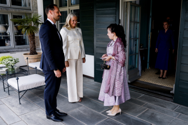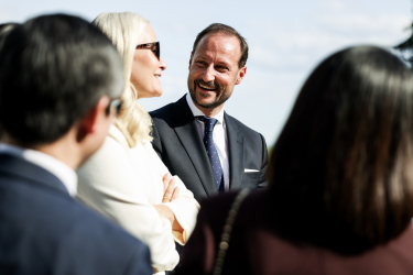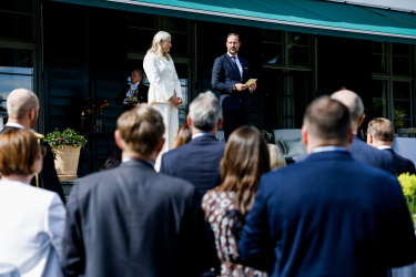 Kronprinsparet ønskte velkomen til mottakinga som fann stad på terrassen på Skaugum i Asker.