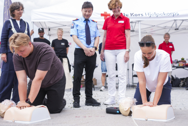 Prinsesse Ingrid Alexandra og Prins Sverre Magnus fikk høre om Røde Kors sitt arbeid og fokus i sommermånedene. På Kadettangen møtte de frivillige fra Røde Kors hjelpekorps, som demonstrerte søk- og redning med drone, redning på vann og hjerte/lunge-redning.