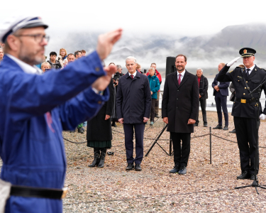 Sammen med statsminister Jonas Gahr Støre og justisminister Astri Aas-Hansen markerte Kronprinsen 100 år siden flagget ble heist på Svalbard for første gang. Foto: Lise Åserud / NTB