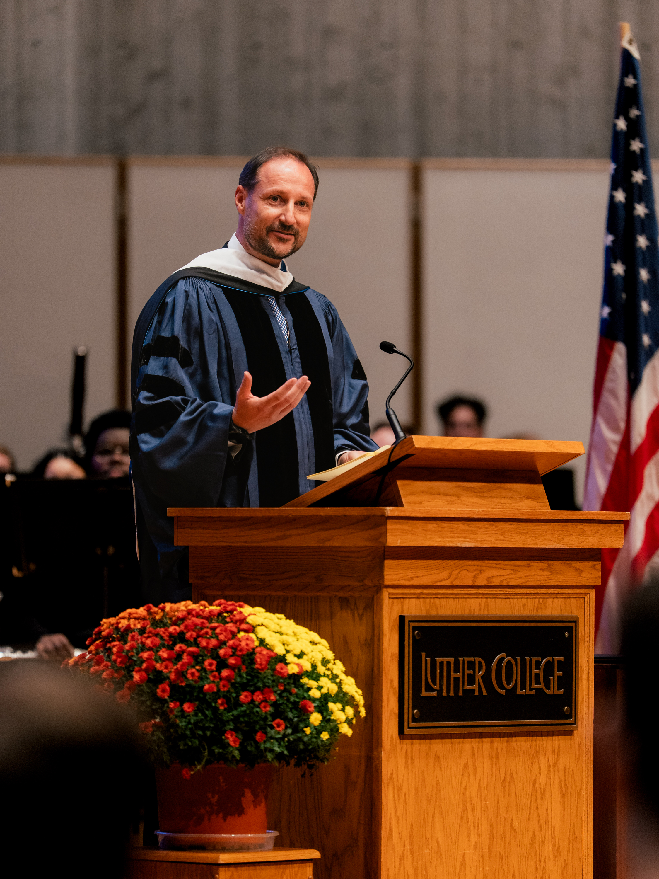 Under en høytidelig seremoni ble Kronprinsen utnevnt til æresdoktor ved Luther College, og i sin takketale appellerte han til studentenes ansvar for å bidra til den frie utviklingen av ideer.