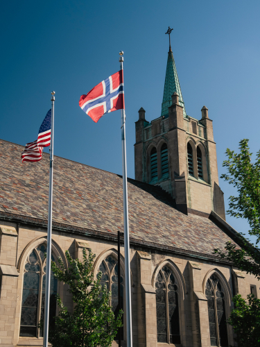 Norway House er nærmeste nabo til Mindekirken, en over 100 år gammel kirke grunnlagt i 1922 og en av få kirker i USA som fortsatt har gudstjenester på norsk. Kirken er en hjørnestein i det norsk-amerikanske miljøet i Minneapolis, og Kong Harald er kirkens høye beskytter.