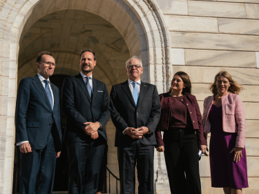 Kronprins Haakon sammen med ambassadør Anniken Huitfeldt, utenriksminister Espen Barth Eide og næringsminister Cecilie Myrseth utenfor Minnesota State Capitol. Foto: Ola Vatn, Det kongelige hoff