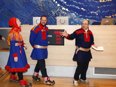 Sámedikki presideanta Egil Olli ja dievasčoahkkima jođiheaddji Jarle Jonassen sávaiga Ruvdnaprinsii ja Ruvdnaprinsessii buresboahtima Sámediggái. Skádjil koarra lávllui Sámisogalávlaga.