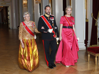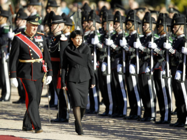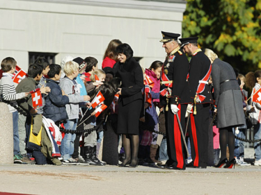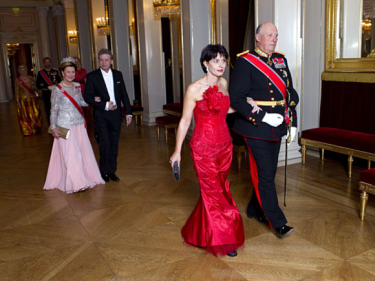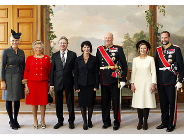 Gonagas Harald ja Dronnet Sonja, geat leaba gussiid láidesteaddjit, ja Ruvdnaprinseassa Mette-Marit sávve Presidentii Leuthard ja dr Hausinii almmolaš buresboahtima Norgii.