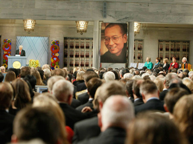 Nobellávdegotti jođiheaddji, Torbjørn Jagland, ságastalai ja čilgii manin sii leat válljen Liu Xiaobo dán jagi ráfibálkášumi vuostáiváldin. Jagland loahpahii sáhkavuorus ja govvidii bálkkašumi geigema go son bijai medállja ja diploma guoros stuolu nala mas Liu Xiaobo livččii galgan čohkkat.