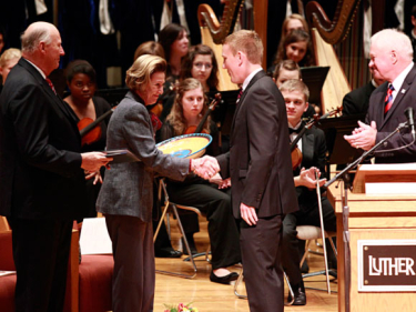 Allaáiggalaš seremoniijas skuvlla feastasálas adde Gonagas Haraldii ja Dronnet Sonjai The Spirit of Luther Award.